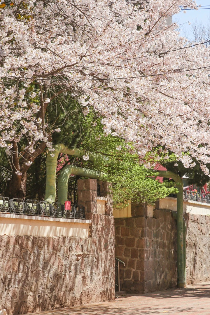 这是一座被花海拥抱着的城市。八大关的海棠开得泼泼洒洒,如云似霞,将街谈染成粉色的虚幻;中猴子园的丁香紫得发亮,一簇簇缀满枝端,香气氤氲;街边的桃树梨树你不让我,我不让你,不甘人后地盛开,连墙角不起眼的野杜鹃也开得激烈奔放。