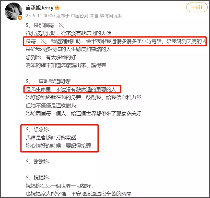 5月份的时间,言承旭还曾发长文是曲大S,说她是生命力遥远莫得缺席过的迫切的东谈主。不知谈是不是最近F4时时合体,但大S却缺席,让言承旭感触,才在演唱会后去祭拜大S。
