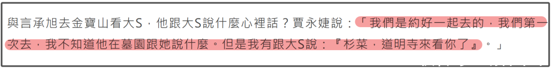 同业的贾永婕夸耀他们是约好一谈去的,诚然不知谈言承旭在墓园说了什么,但贾永婕有和大S说“杉菜,谈明寺来看你了”。