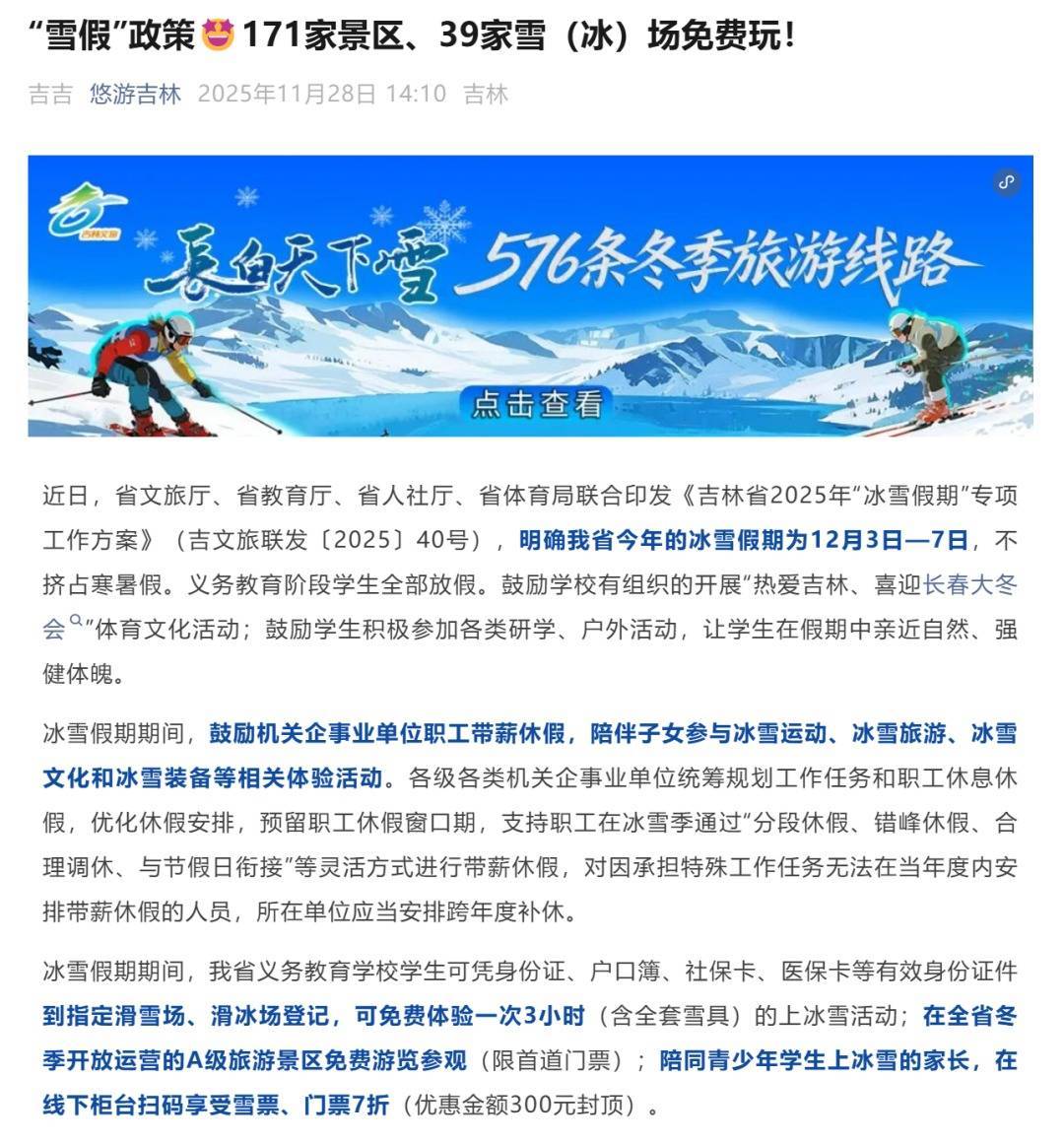 11月28日,吉林省文化和旅游厅发布讯息,面向全省义务教会学生,将2025年12月3日至7日缔造为“冰雪假期”,同期饱读吹员工带薪放假,并面向学生和家长出台多项优惠计谋,致力推动冰雪指引普及与发展,欢快冰雪市集。