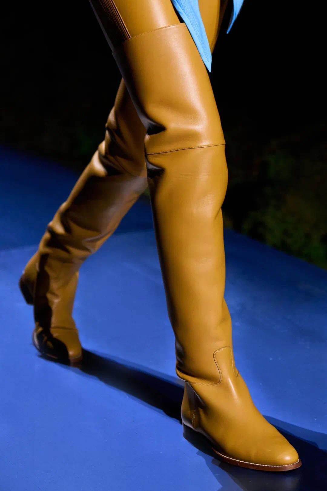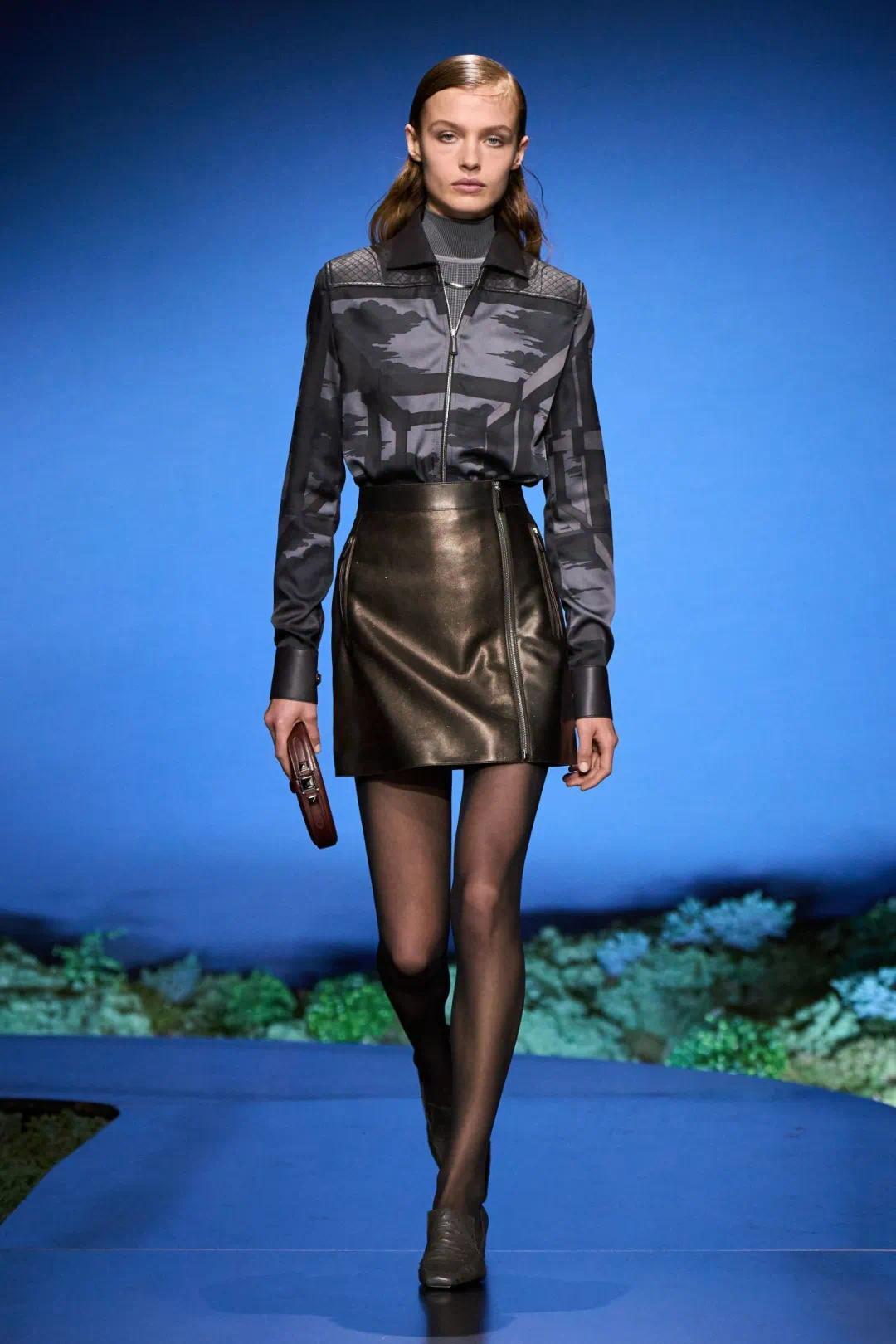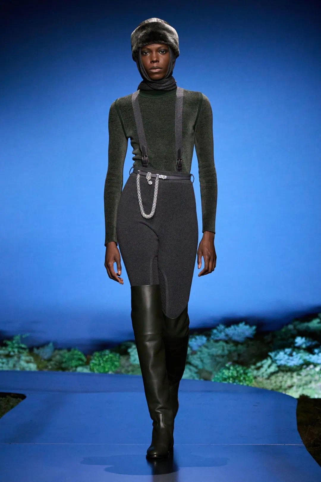 关于速率、标的感、均衡与力量的探索,让时装呈现干净而历害的线条,A字详尽与马裤的比例让躯壳在动作时免于抑止。这一季的诡计陆续并深化了爱马仕一贯的廓形,并不依赖夸张比例或戏剧化造型来制造视觉冲击,而是在克制的详尽顺序之中,通过比例、长度与线索相干的玄妙转移,构建出一种既相识又具有畅通明劲的女性形象。