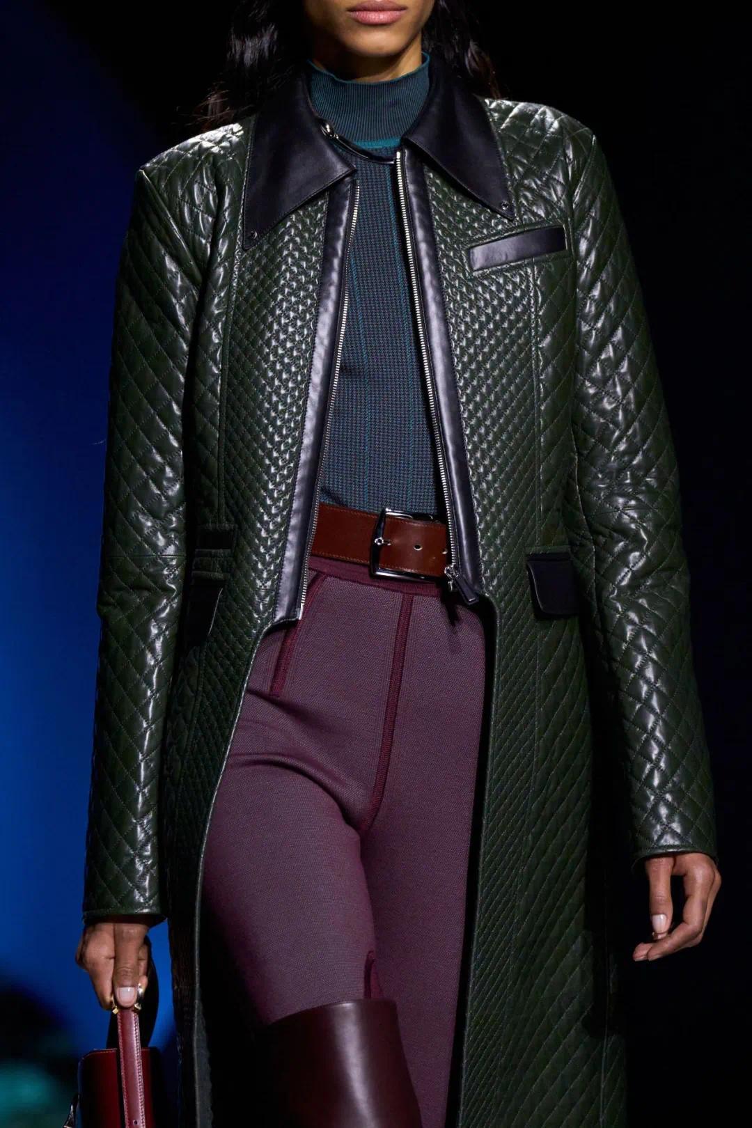 皮革与羊毛成为荟萃全季的两种关键面料。前者具有光泽、密度与结构感,或者勾画出了了的详尽;后者则以柔嫩、蓬松与吸光的质量,为举座造型带来温度与深度。当这两种材质被并置或类似期,服装名义便产生了玄妙而丰富的线索:皮革在光泽下闪耀,羊毛则以柔软的面目接纳光泽,使造型在明暗之间酿成流动的质感变化。这种对比不仅强化了服装的触觉念念象,也使极为精真金不怕火的廓形不至于显得单薄。